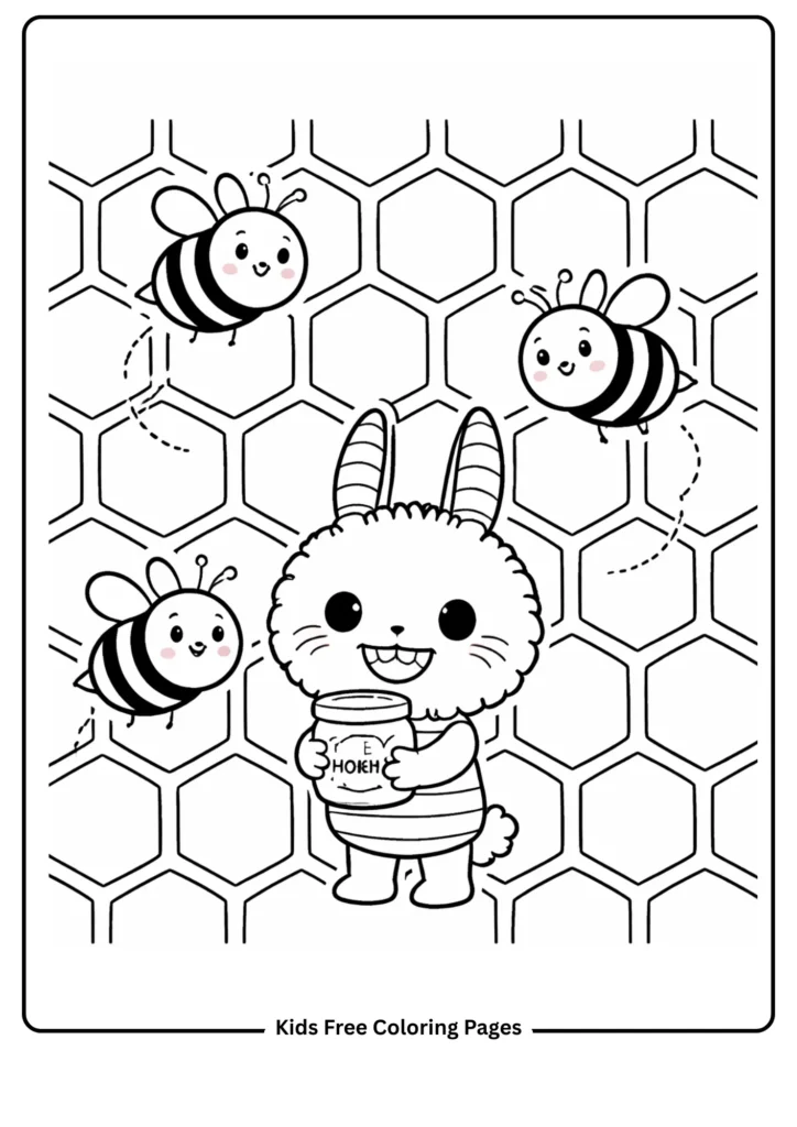 Three cheerful round bees with striped bodies and simple wings buzz busily around Labubu, who holds a small jar of honey with a big smile. The background features large honeycomb hexagons — perfectly drawn in clean geometric lines — creating an excellent opportunity to introduce hexagon shapes and pattern repetition to young learners. Children can color each honeycomb cell a different shade of yellow, orange, or gold, or create a rainbow honeycomb for a more creative interpretation. This page works beautifully for nature and insect learning units, geometry shape lessons, or simply as an engaging art activity. The contrast between the organic bee shapes and the structured honeycomb grid makes for a visually rich finished piece.