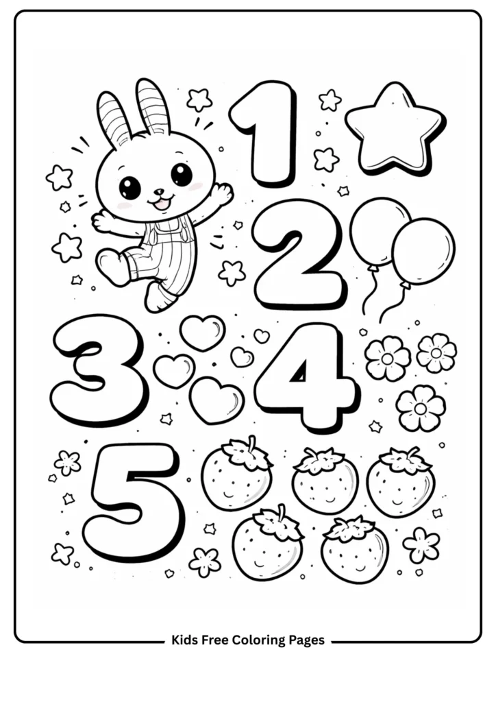 Labubu jumps excitedly beside bold oversized numbers 1 through 5, each number decorated with matching illustrated objects to count — one star beside the 1, two balloons beside the 2, and so on. The numbers are rounded and friendly rather than rigid, making them approachable for preschool and kindergarten-age children. The counting objects are simple and clearly defined with enough space between them for accurate one-to-one counting practice during the coloring session. This page works perfectly as a math warm-up activity, a quiet classroom filler, or a homeschool number recognition exercise. Encourage children to color each number and its matching objects the same color to reinforce the number-quantity connection.