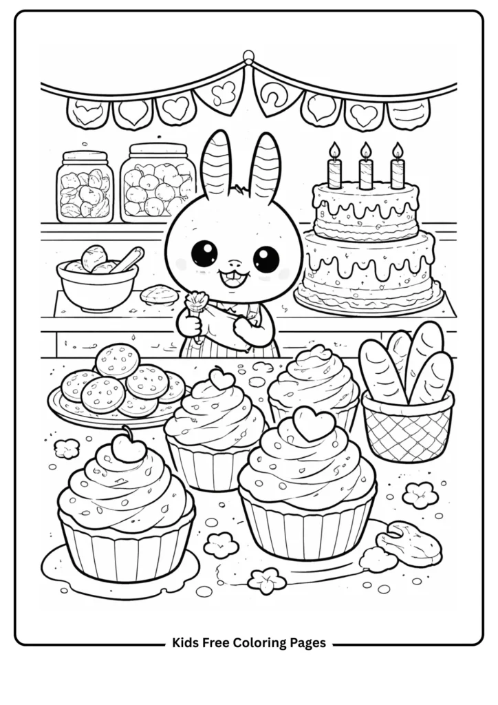 Labubu stands proudly behind a bakery counter surrounded by an irresistible spread of giant rounded cupcakes piled high with swirled frosting, a tiered birthday cake covered in dots and candles, oversized cookies with cross-hatch patterns, and a friendly baguette in a basket. Each treat has intentionally simple but varied surface patterns — swirls, dots, stripes — that children can use as guides or completely reimagine with their own designs. This page is fantastic for developing pattern recognition and sequential coloring skills. Kids can practice realistic food colors or go completely imaginative with rainbow frosting and polka-dot cakes. Glitter gel pens on the frosting create an irresistible finished effect!