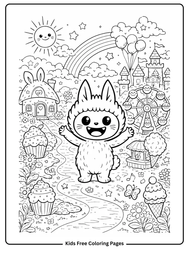 In this deliciously imaginative scene, Labubu skips down a winding path made entirely of large lollipops while giant candy canes serve as lampposts along the route. Cupcake mountains rise in the background, a chocolate river winds through the valley, and gummy bear trees line the horizon. The sky features cloud shapes that look suspiciously like whipped cream swirls. Every surface is designed with a distinct simple pattern — swirls on lollipops, stripes on candy canes, dot patterns on gumdrops — so that each section of the page has its own coloring personality. This is consistently one of the most requested pages from children aged 4 to 8, and the finished results, regardless of color choice, are uniformly dazzling.