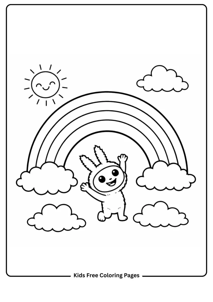 Labubu stretches both paws upward toward a wide rainbow arching across a sky full of puffy rounded clouds. A cheerful smiling sun peeks from the upper corner, its simple ray lines extending outward like a children’s illustration. The bold rainbow stripes are wide and clearly defined, making this an ideal page for teaching color order (red, orange, yellow, green, blue, indigo, violet) while developing motor control as kids work along the curved stripes. This sheet works beautifully for weather-themed lessons or simply as a celebration of color itself. Encourage kids to try classic rainbow hues, a dreamy pastel sunset version, or experiment with watercolor pencils for a softly blended sky effect.